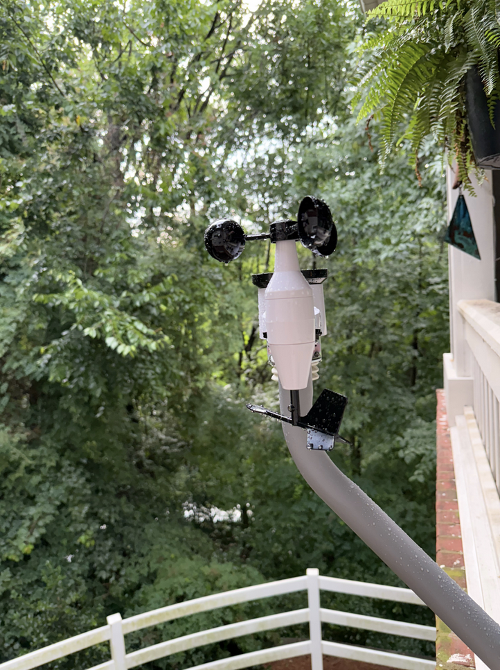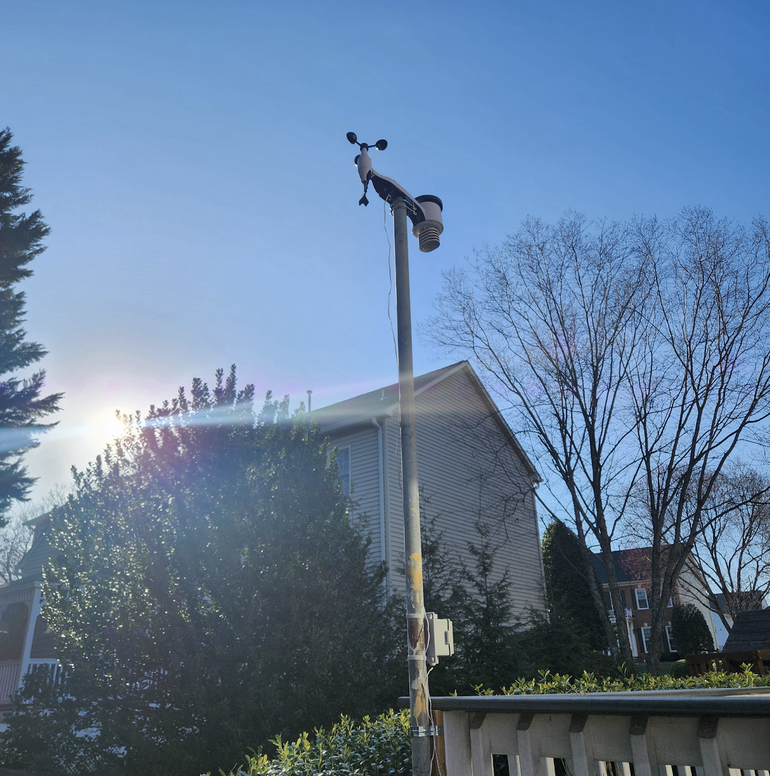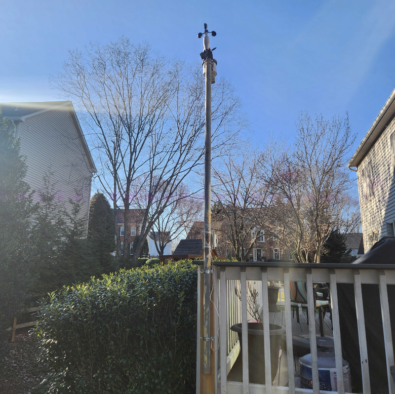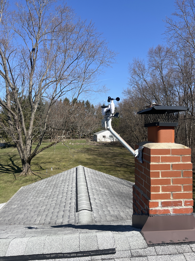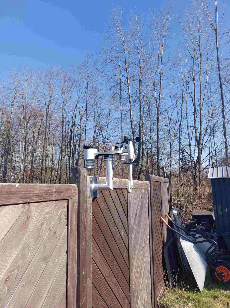 - The photo that would depict the southern horizon is missing. If it were available, it would likely show that the roof reaches a level higher than the station, blocking at least the airflow (if not also sunlight when the sun is low, for example). If the station were placed at the roof’s peak on a mast of at least 1.25 m, the roof would not have a significant impact on wind and temperature measurements.